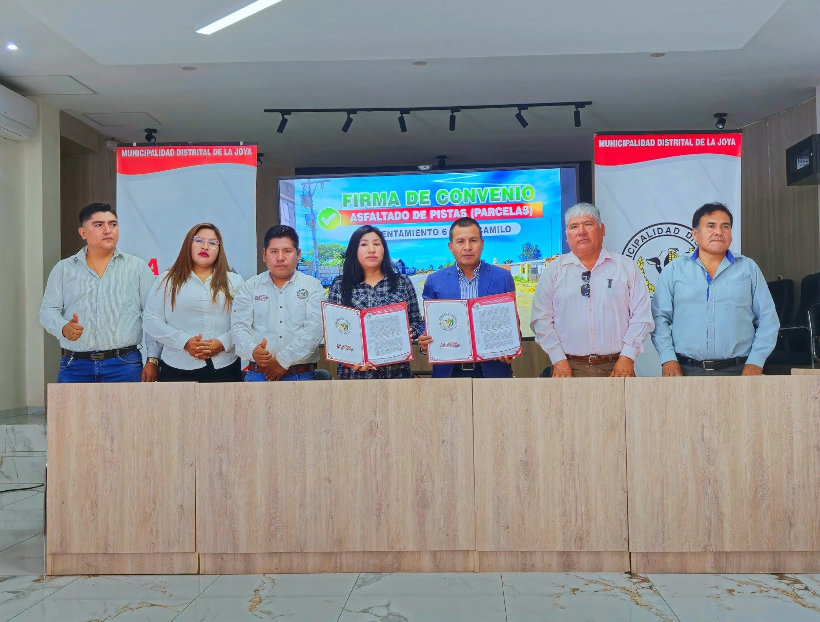 La Municipalidad de La Joya suscribió el Convenio n.° 06-2025-MDLJ con el consorcio San Camilo para iniciar el asfaltado de las vías del Asentamiento 6 de San Camilo, una obra cuya ejecución tendrá una duración de 180 días calendarios. Con este acuerdo, se pone en marcha un proyecto largamente solicitado por los agricultores del sector.